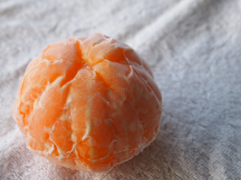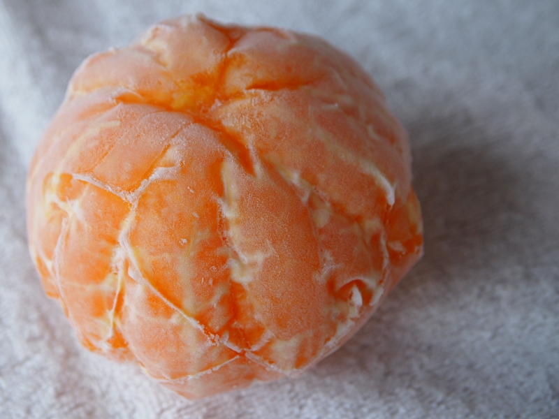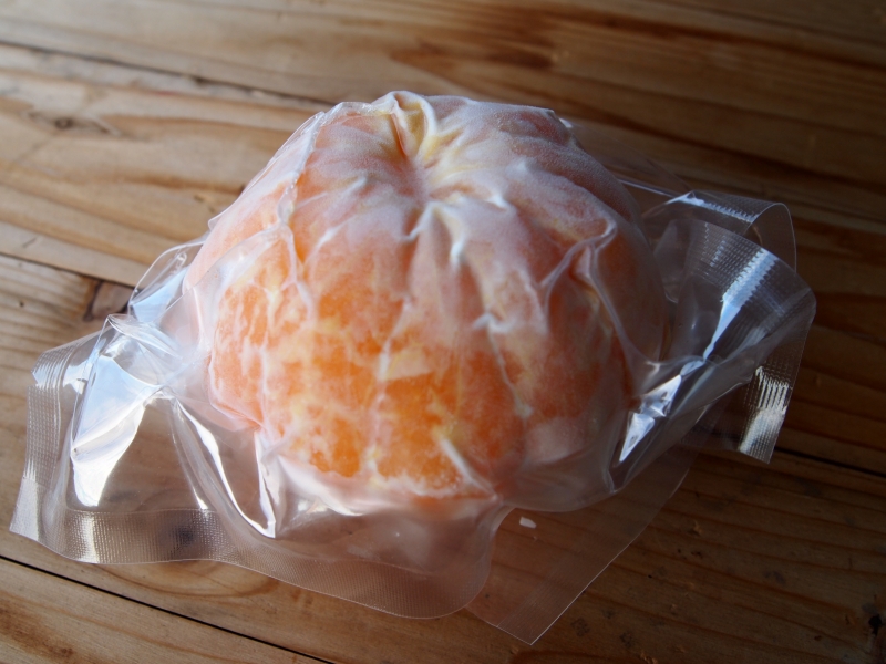 食品加工場で保健所の工程に従い、洗浄し不知火の外皮を一個一個丁寧にむき、すぐに真空パックをして食品表示ラベルを貼り冷凍保存します。