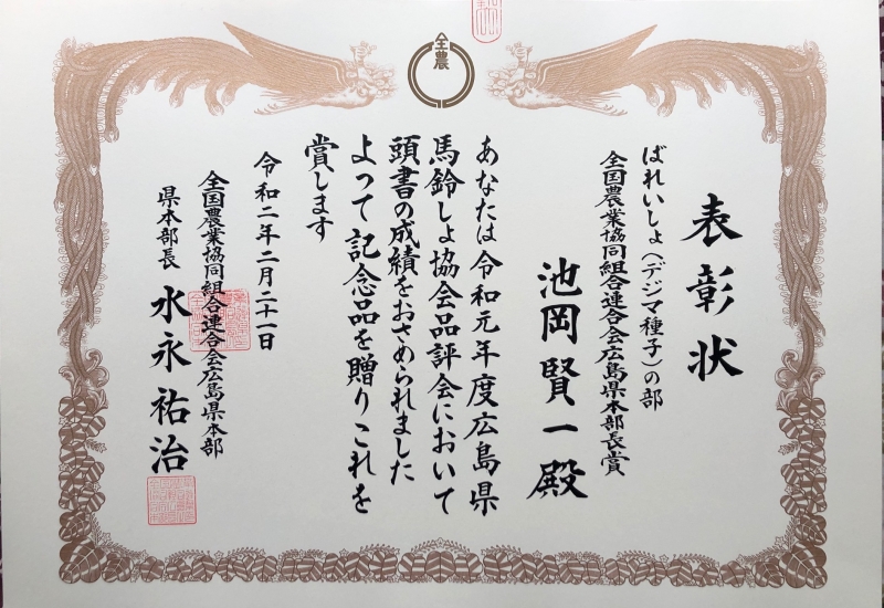 種芋の出荷も行っており、広島県馬鈴しょ協会の令和元年度品評会で「全国農業協同組合連合会広島県本部長賞」をいただきました。