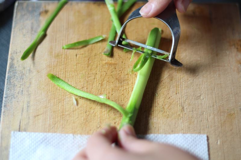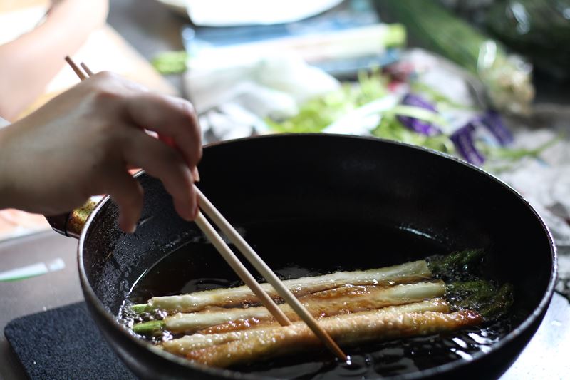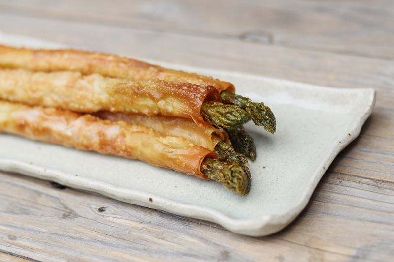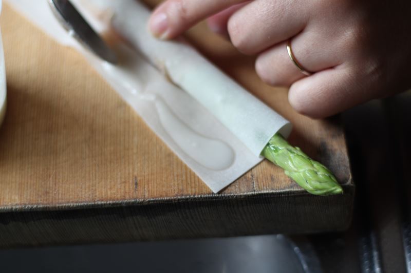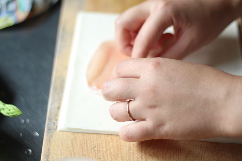 春巻きの皮に生ハムとアスパラをのせ、巻いていきます。