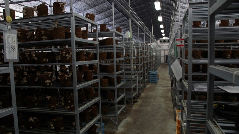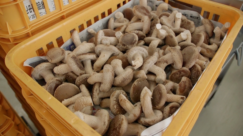 菌床は、野菜の畑に当たるものだ。土作りをするように菌床から作る場合もあるが、同社では、品質や数量の安定の意味で、信頼できる国内2箇所の業者から質の高いものを仕入れている。入荷後に洗浄し、そのまま培養できるタイプもあるが、コスト高になってしまうため、自社内で110日の間、熟成させることもある。熟成して十分に菌が回った菌床は、袋を開けて酸素を吸わせたり、適度な振動を与えたりすることで、プリっとしたしいたけが、にょきにょきと生えてくる。それから棚入れ、間引き、収穫、芽切りなどしいたけが顔を出し始めてから出荷までのサイクルが短いので、テキパキと作業を進めなければならない。作業になれた現場のスタッフの手際も良い。見事なチームプレーである。しいたけの需要が伸びる冬場には、1日に300㎏程も出荷することがあるそうだ。