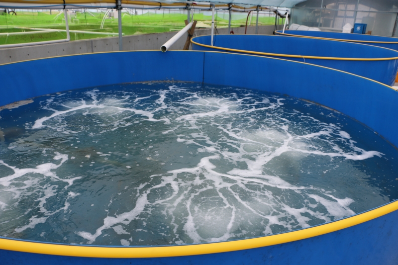 バナメイエビの陸上養殖において、水の管理はもっとも重要である。同社では、すぐ傍の瀬戸内海の海水をくみ上げ、ろ過装置や微生物の働きで汚れた水を浄化させるという閉鎖循環式という方法で水質を管理している。ただエビは新陳代謝が盛んなのか、水がすぐに汚れてしまうのが課題だ。また成長のたびに脱皮を繰り返すので、殻の処理も大変なのだという。水質の管理は、数値だけみて安心したりせず、目視での確認、ヒトの手で抜き取り検査を行うなどして管理を徹底している。