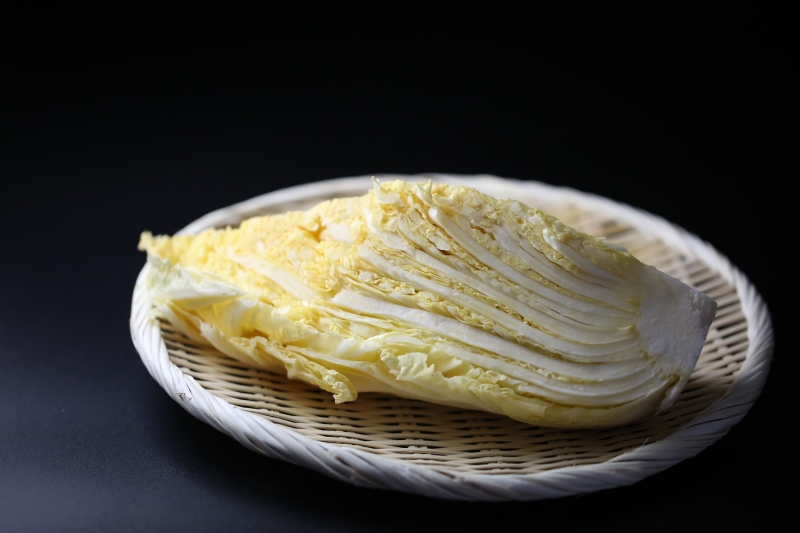 白菜は英語でChinese Cabbage、中国からやってきた野菜のひとつ。そのせいか、中華料理風な煮込みやスープ、炒め物など加熱する野菜として使われることも多い。家庭で白菜漬けを作るのが当たり前だった時代は去り、白菜は半分どころか、1/8までにカットされて売られることもある。しかしこれが非常にもったいないことだと知ってほしい。特にこの「太陽の白菜」においては、できるだけカットしていない状態で買い求めたい。切ってから10分後の一番きれいな色を目の当たりにできるのは、この白菜を丸々の姿で買った方だけの楽しみなのだ。