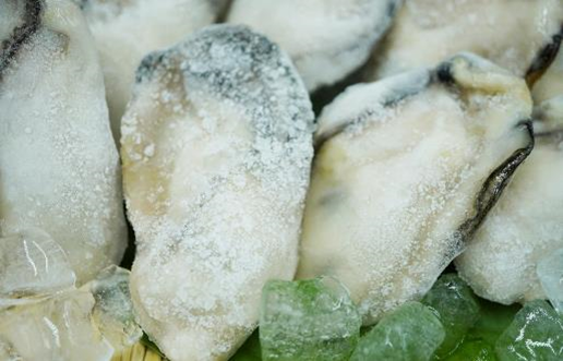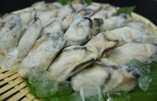 むき身にしたかきは当日中に選別・冷凍処理します。一粒ずつ専用の機械で急速冷凍し,中心温度を-20℃以下にした後,かきの表面に氷の膜を形成させます。こうすることで,冷凍保存中の乾燥や脂質の酸化を抑制することができ,解凍してもむき身直後と同じような風味や味わいを維持しています。