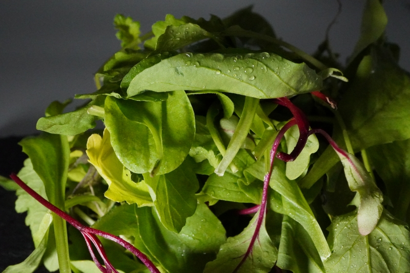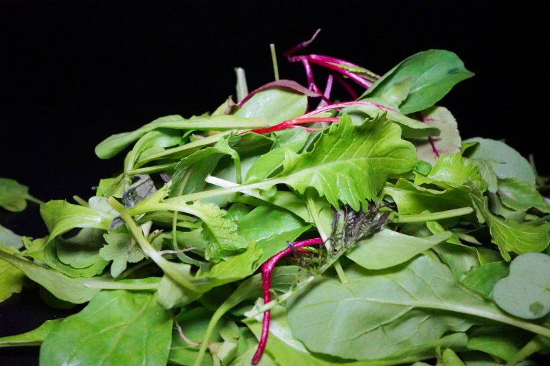 ①土耕栽培ならではの野菜の風味と香りと、②肉厚で食感が良く鮮度の保ちが良いこと、③飽きを感じさせない四季に応じたラインナップであることです。ルッコラ、カラシミズナ、カラシナ、クレソン、ビート、レッドオーク、トレビス、紫蘇、アマランサス、春菊、えごま、レッドケールの全種12品目(令和3年11月現在)の中から常時7種類以上を栽培しています。施設で栽培しているので一年を通して安定的に供給できるのも特徴です。