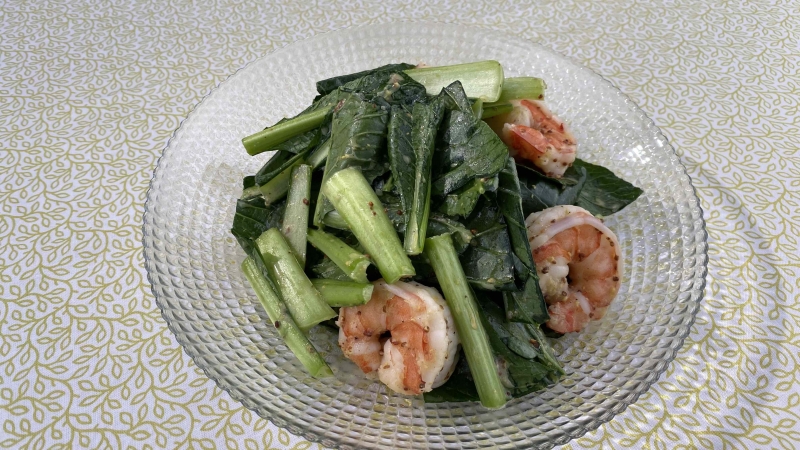 - カットした小松菜とエビを入れてドレッシングを良く合わせる。
