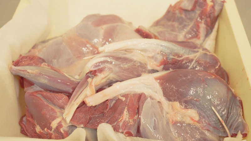 内臓を捕った後、皮が着いたまま冷蔵庫の中で3~7日干します。通常、皮を剥く時に菌が着きますが、個体を干す前に皮の外まで菌がない状態まで洗浄しています。その作業をすることで皮を剥く時に肉に菌がうつることがないように徹底しています。