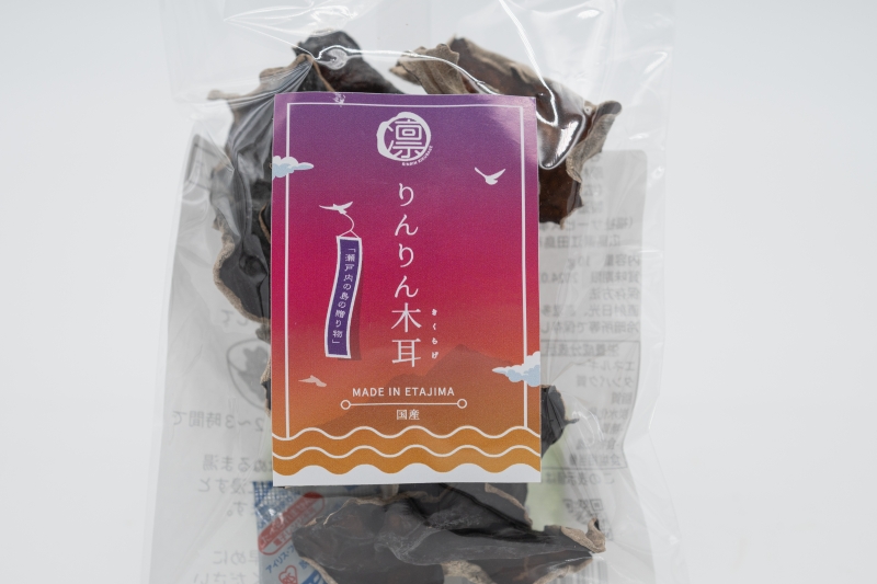 原料のきくらげは、森産業株式会社で開発された、純国産菌床アラゲキクラゲ森89号を使用しています。栽培はハウスで行い、無農薬で江田島の陀峯山の地下水を使用しています。きくらげの栽培には、水の適切な管理が不可欠です。そのため、灌水設備を完備し、夜間にも自動ミスト散水を行う等、丁寧に栽培しています。