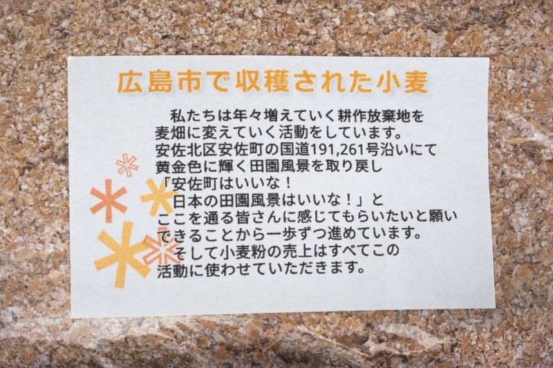 西日本で主に栽培されているミナミノカオリという品種の小麦から精製されます。広島市安佐北区安佐町で栽培された小麦のみを使用しています。