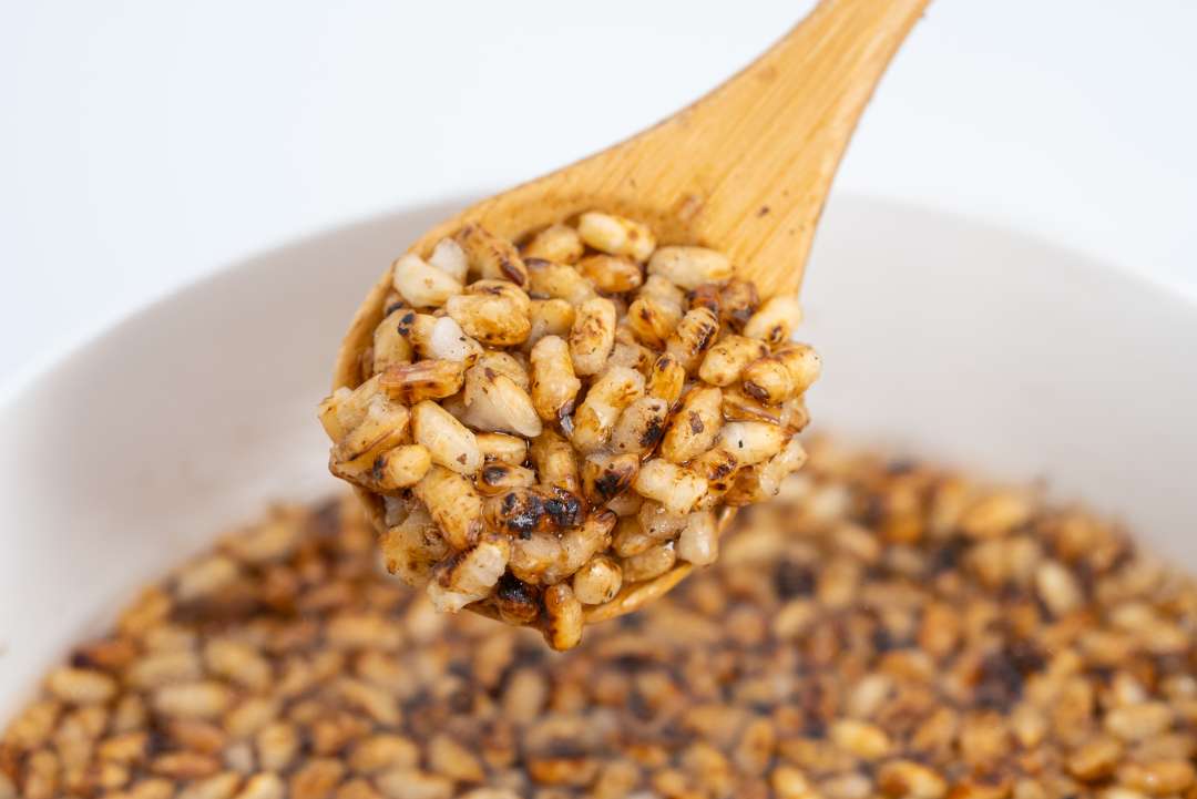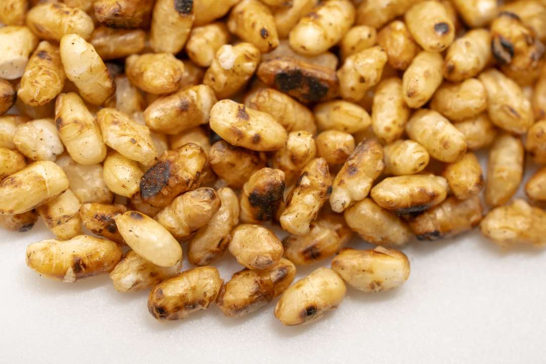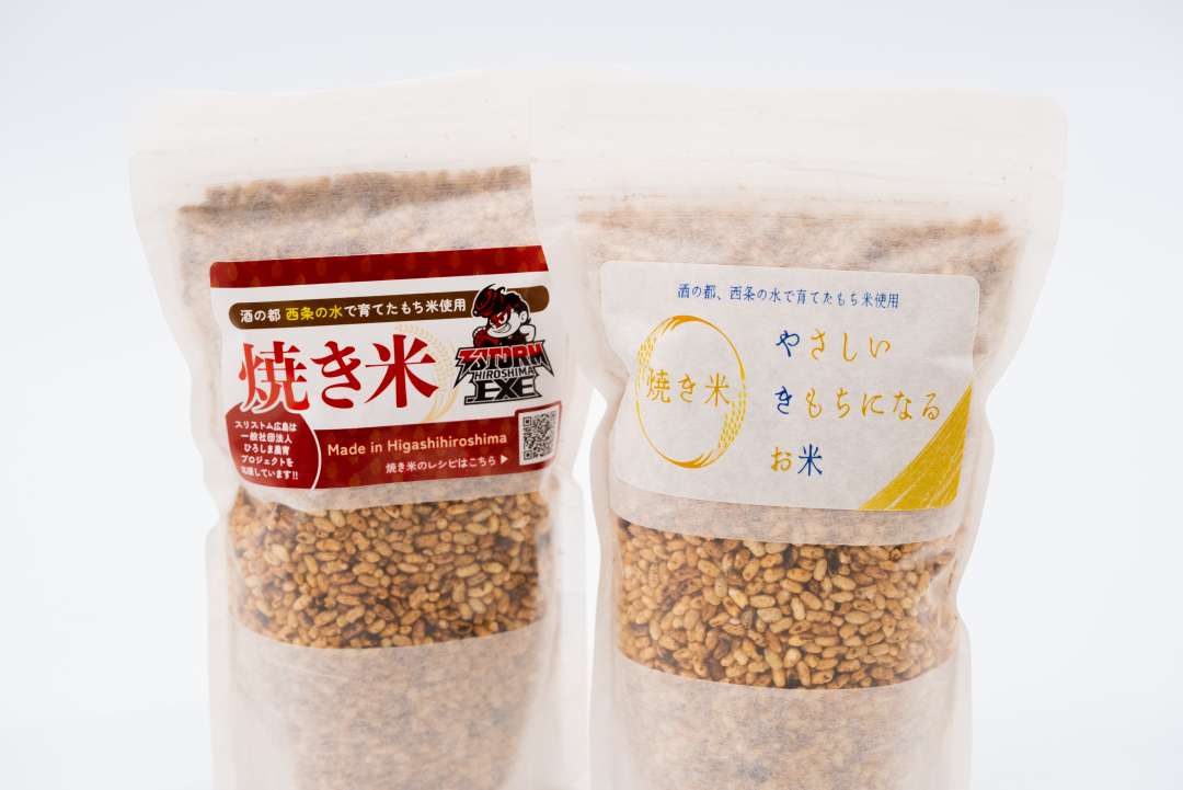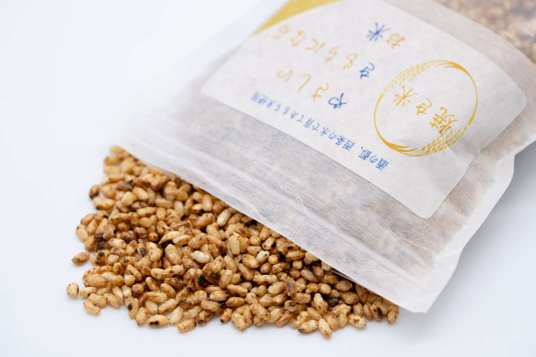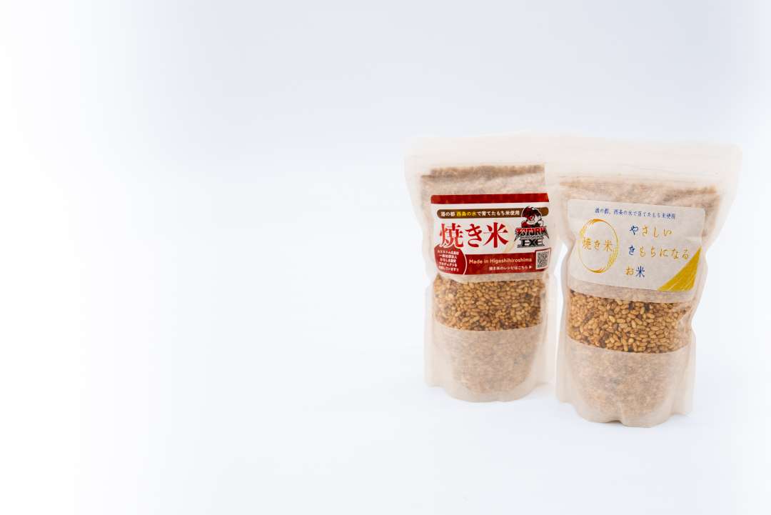広島県内で作られている従来の焼き米とは異なり、粒を潰さずに加工しております。もち米の豊かな弾力と焼き米特有の香ばしさを味わうことが出来る商品となっています。