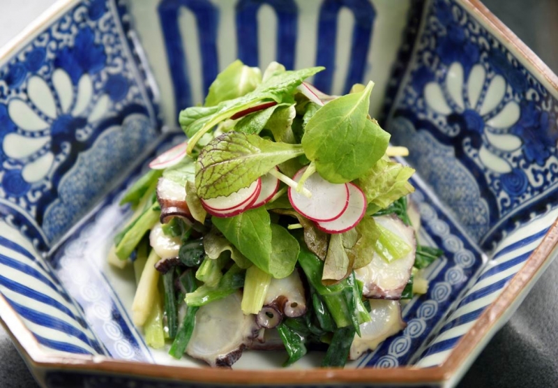 スライスしたボイル蛸と分葱と鉄砲酢を和え,盛り付け,ベビーリーフを上に載せます。
