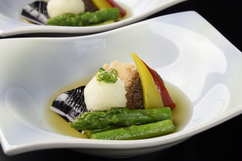 - 冷やしておいた調味料を③に浸し、大根卸し刻み葱をのせて召し上がります。