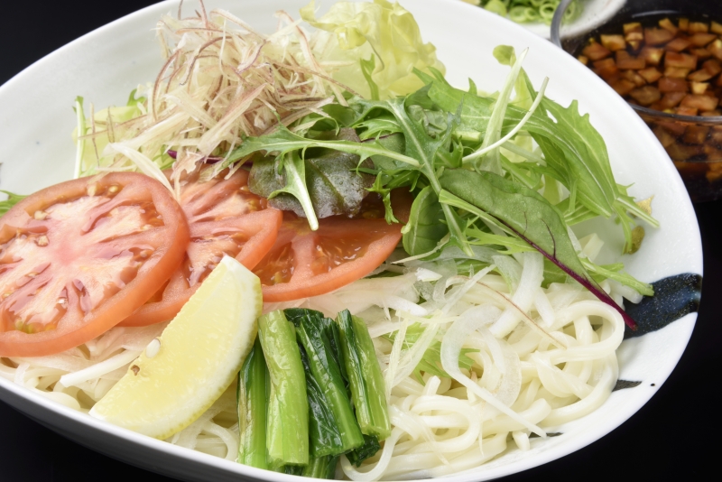 - うどんを湯がいて冷やし水分を切って、器にレタスを敷いてうどんを盛り、2と3の野菜を彩り良く盛る。