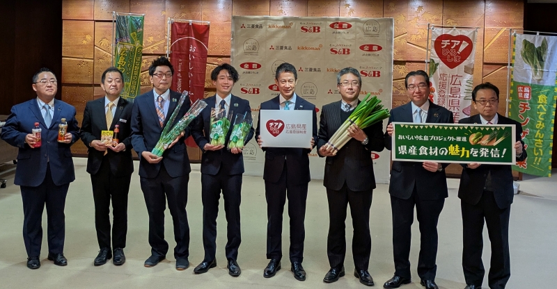 この報告のため、2月5日(水)、三菱食品株式会社、JA全農ひろしま、エスビー食品株式会社、キッコーマン食品株式会社、生産者を代表して、JAひろしま野菜生産部会チンゲンサイグループ・白ネギグループ、JA尾道市わけぎ部会の皆さんが、知事を表敬訪問されました。