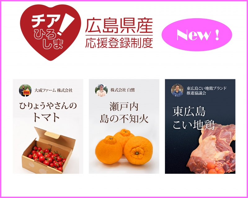 チア!ひろしま 広島県産応援登録制度に新たに追加された商品の紹介ページが完成しましたので、ご紹介します!●「ひりょうやさんのトマト」 大成ファーム 株式会社 ●「瀬戸内 島の不知火」 株式会社 白鷺 ●「東広島こい地鶏」 東広島こい地鶏ブランド推進協議会 ・登録商品の紹介(商品の特徴やこだわり、店頭で使える商品写真・ポップなど)・生産者の紹介・メッセージ(農業への思いやこだわり、インタビュー動画など)等が掲載されていますので是非ご覧ください。